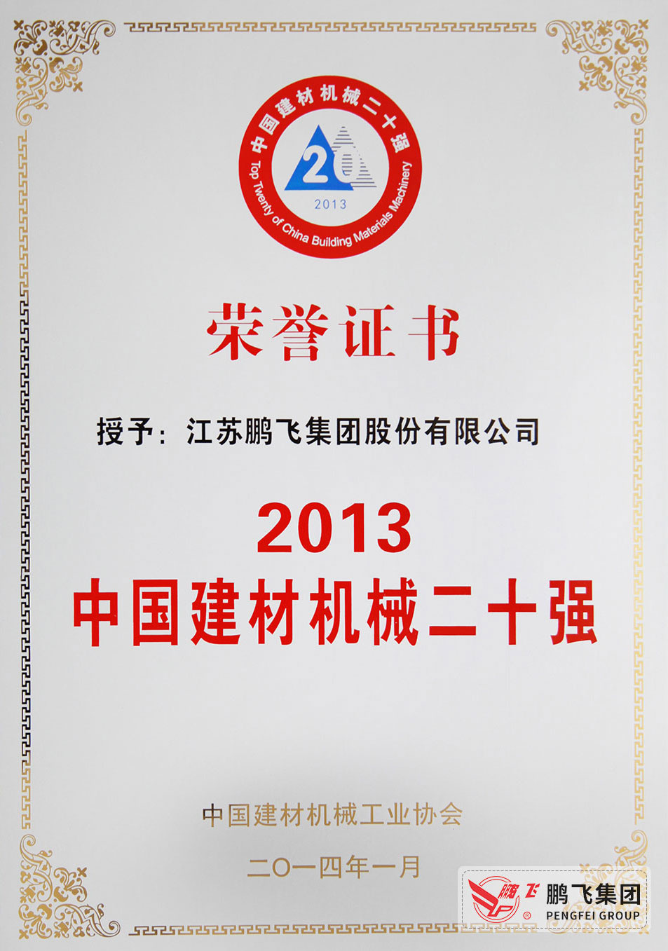 (2014年1月)建材機(jī)械20強(qiáng)(獎(jiǎng)牌)