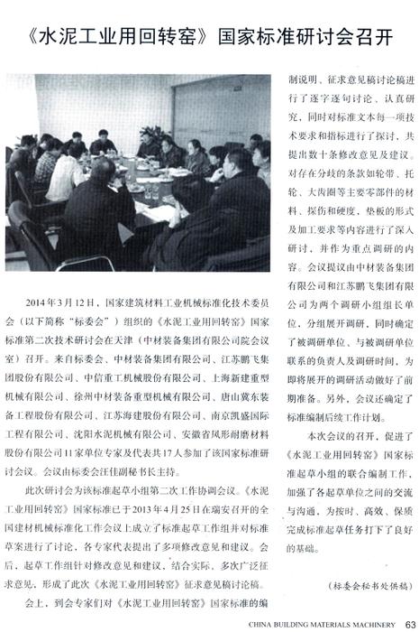 2014年3月12日,國(guó)家建筑材料工業(yè)機(jī)械標(biāo)準(zhǔn)化技術(shù)委員會(huì)組織的國(guó)家標(biāo)準(zhǔn)第二次技術(shù)研討會(huì)在天津召開。江蘇鵬飛集團(tuán)股份有限公司等11家單位專家及代表共17人參加了該國(guó)家標(biāo)準(zhǔn)研討會(huì)議。