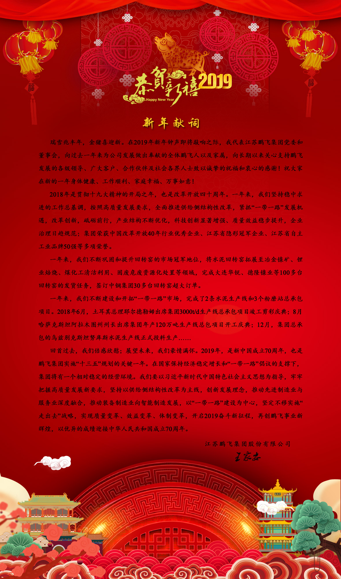 瑞雪兆豐年,金豬喜迎新。在2019年新年鐘聲即將敲響之際,我代表江蘇鵬飛集團黨委和董事會,向過去一年來為公司發(fā)展做出奉獻的全體鵬飛人以及家屬,向長期以來關心支持鵬飛發(fā)展的各級領導、廣大客戶、合作伙伴及社會各界人士致以誠摯的祝福和衷心的感謝!祝大家在新的一年身體健康、工作順利、家庭幸福、萬事如意!