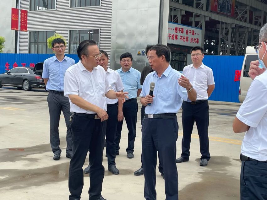 江蘇鵬飛集團(tuán)股份有限公司資源綜合利用成套裝備生產(chǎn)項(xiàng)目現(xiàn)場(chǎng),黃衛(wèi)成聽取了公司董事長(zhǎng)王家安關(guān)于資源綜合利用成套裝備生產(chǎn)項(xiàng)目的投資規(guī)模、用地面積、建筑面積、建設(shè)進(jìn)度等情況的介紹。此外,他還就項(xiàng)目建設(shè)的手續(xù)審批、大件產(chǎn)品的運(yùn)輸、疫情對(duì)公司產(chǎn)品出口造成的影響等問題與王家安進(jìn)行交流。