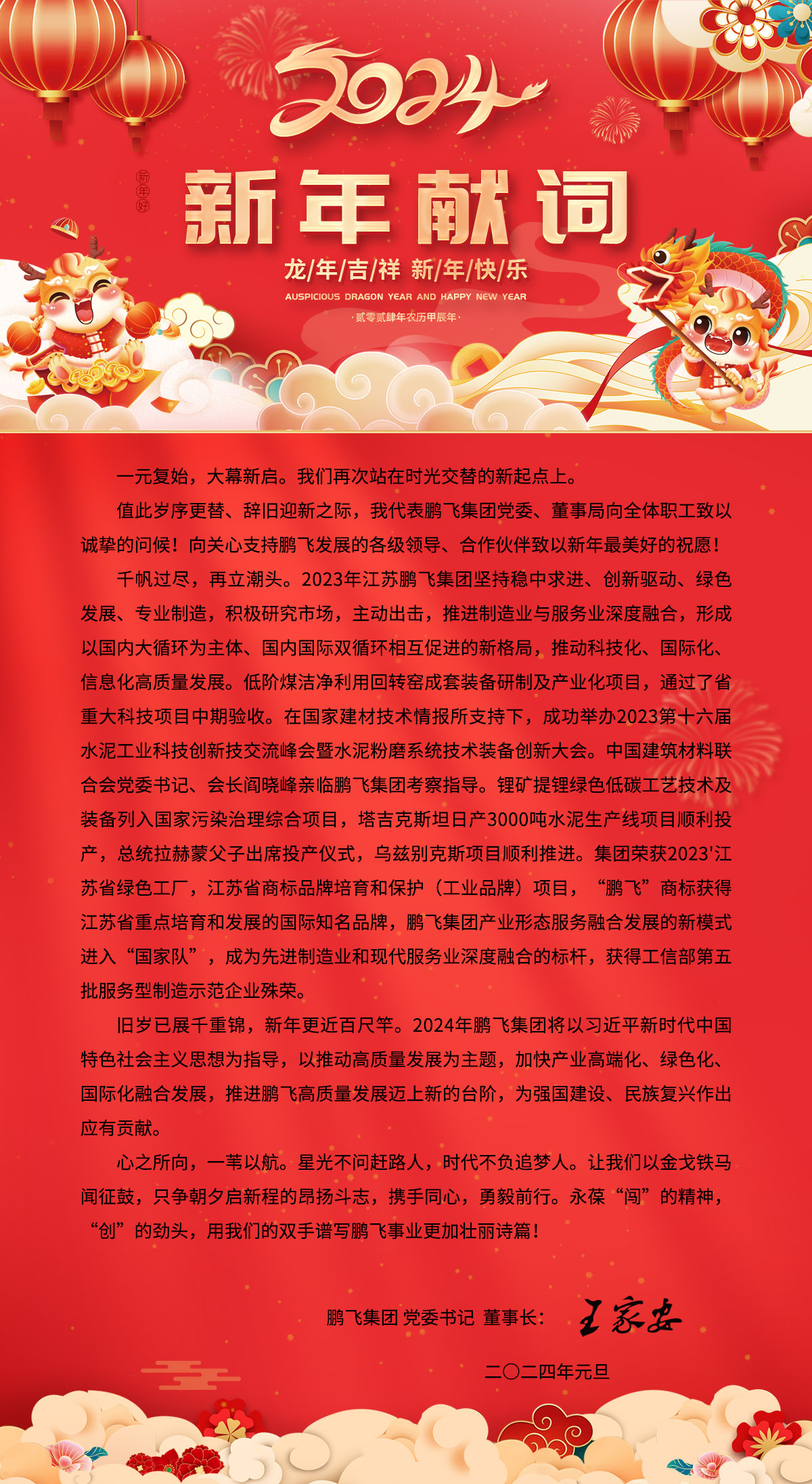 龍年吉祥 新年快樂 江蘇鵬飛集團(tuán)董事長王家安元旦獻(xiàn)詞