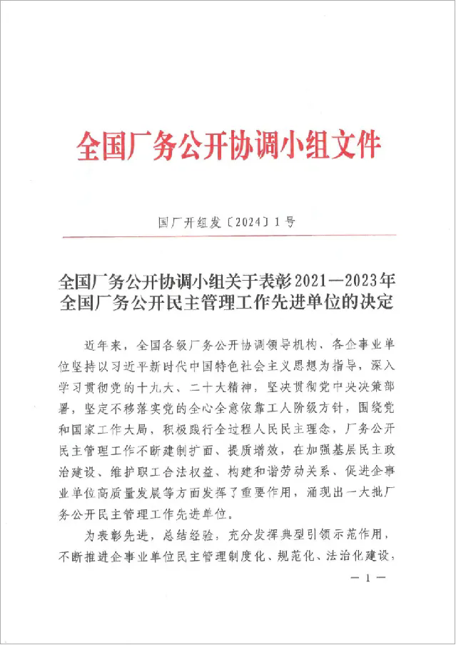 近日,全國廠務(wù)公開協(xié)調(diào)小組印發(fā)《關(guān)于表彰2021-2023年全國廠務(wù)公開民主管理工作先進單位的決定》,江蘇鵬飛集團股份有限公司被表彰為全國廠務(wù)公開民主管理工作先進單位。