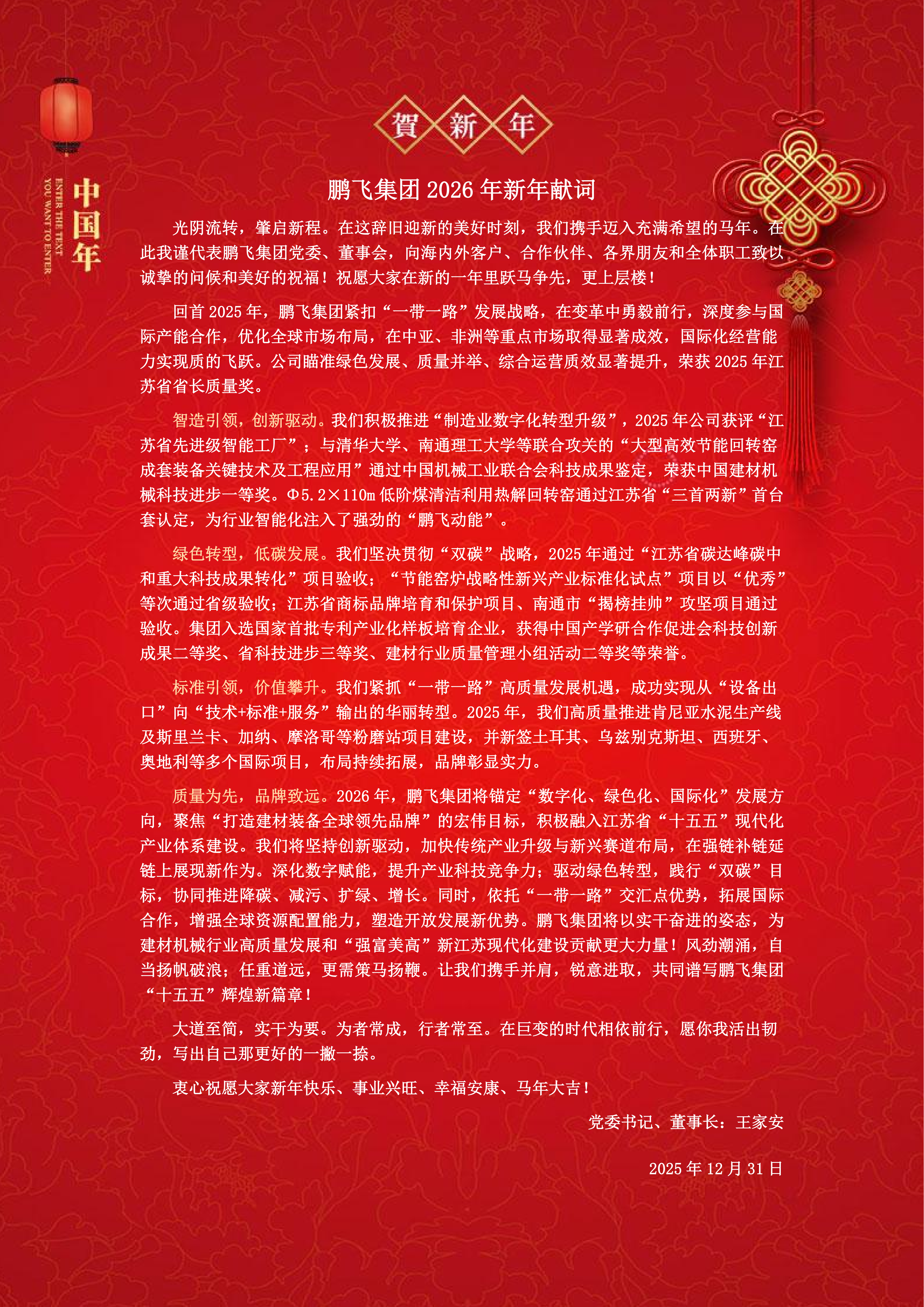駿馬奔騰 萬(wàn)象更新 | 鵬飛集團(tuán)2026年新年獻(xiàn)詞