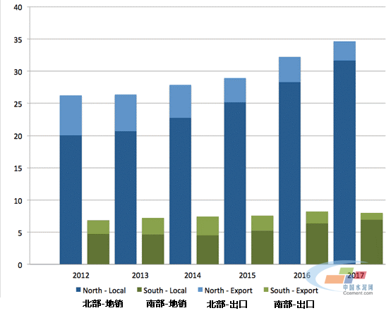 上圖展現(xiàn)了巴基斯坦國內(nèi)水泥行業(yè)的現(xiàn)狀,巴基斯坦的年度水泥消費(fèi)量從2012年的3310萬噸增長到了2017年的4280萬噸,增長幅度在30%左右,其中五分之四的水泥消費(fèi)集中在巴基斯坦的北部地區(qū)。與此同時,更重要的是,巴基斯坦的出口水泥從2013年的830萬噸降低到了2017年的420萬噸。造成這一現(xiàn)象的主要原因是阿富汗市場的下跌,以及水性熟料出口量的減少。考慮到南方市場的出口水泥比例較高,盡管水泥總消費(fèi)量在增長,但是出口量的減少對南方可能會造成更大的打擊。2018年到目前為止,類似的趨勢依然存在,唯一有所改變的是南方熟料出口量的在今年有反彈的跡象。