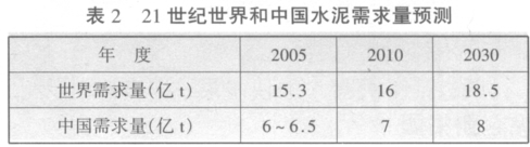 21世紀(jì)世界和我國水泥的生產(chǎn)與消費(fèi)仍將保持一定速度增長,但不是很高。表 2 是世界和中國水泥需求量的預(yù)測。