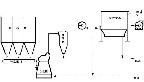 2.氣體流程:熱風(fēng)→立式磨→旋風(fēng)收塵器→1號(hào)排風(fēng)機(jī)→袋收塵器→2號(hào)排風(fēng)機(jī)→排空。 循環(huán)風(fēng)(余熱利用)