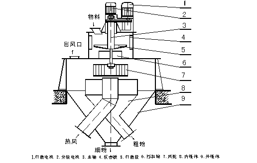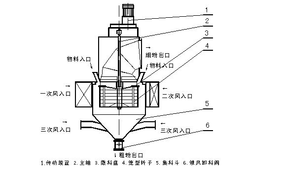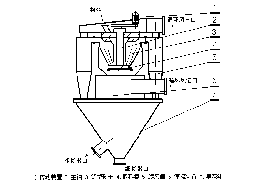 由傳動(dòng)裝置、回轉(zhuǎn)部分(主軸、撒料盤、轉(zhuǎn)子等),機(jī)殼(內(nèi)筒、導(dǎo)向葉片、內(nèi)錐體、外筒、外錐體、進(jìn)風(fēng)口、加料口、兩個(gè)粗粉出口等),細(xì)粉收集裝置(四個(gè)旋風(fēng)筒等)組成。