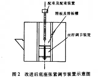 原來(lái)設(shè)計(jì)的配重裝置采用兩邊齒條,通過(guò)配重和下滾筒的自重進(jìn)行皮帶張緊,兩邊調(diào)節(jié)裝置同時(shí)調(diào)節(jié)皮帶的跑偏情況。從理論上講沒(méi)有問(wèn)題,但實(shí)際使用中皮帶兩邊跑偏嚴(yán)重,無(wú)法進(jìn)行調(diào)整,增大配重或偏向提升或下沉齒條都無(wú)法解決問(wèn)題。經(jīng)研究分析,我們將配重連接M32的絲桿,在導(dǎo)向板的下半部分設(shè)置調(diào)節(jié)裝置,解決了問(wèn)題。改進(jìn)前后見(jiàn)圖1、圖2。