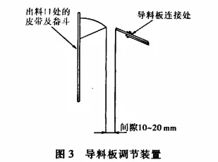 由圖3可見(jiàn),間隙應(yīng)調(diào)整在10-20mm,不能太大,也不能太小。間隙太小,機(jī)組運(yùn)行時(shí),畚斗與導(dǎo)料板相碰,無(wú)法運(yùn)行。間隙太大,則回料太多,導(dǎo)致機(jī)組箱體內(nèi)堵料而停車。導(dǎo)料板系易損件,平時(shí)應(yīng)經(jīng)常檢查導(dǎo)料板的磨損情況,做到及時(shí)更換,并保證安裝牢固。