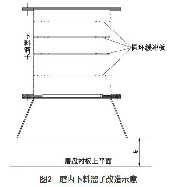 一方面它降低了入磨物料高落差對(duì)溜子的沖刷,另一方面圓環(huán)的收口作用使得物料的下料點(diǎn)發(fā)生了變化,將原先的單點(diǎn)偏心下料改成接近中心下料,改善了物料在磨盤(pán)上的偏離現(xiàn)象。同時(shí),適當(dāng)調(diào)整h值的大小(原設(shè)計(jì)600mm,最終改為400mm),使得下料波動(dòng)時(shí),可以起到一定的緩沖作用,穩(wěn)定料床。