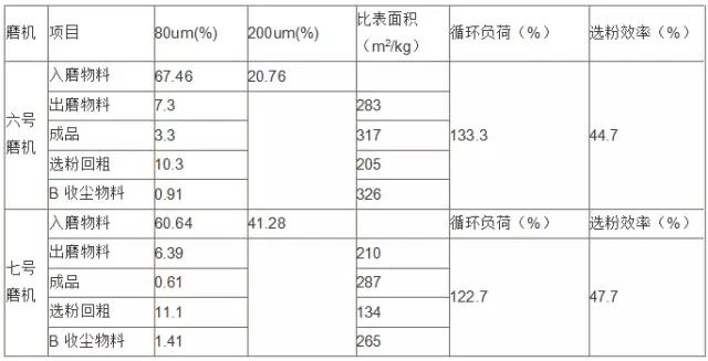2、同時對六七號磨機的入磨物料、出磨物料、選粉機回粗、B收塵的物料、水泥成品、在磨機運轉(zhuǎn)正常的情況下進行取樣,做80um、200um、及比表面積以計算磨機的循環(huán)負荷和選粉機的選粉效率。測量結(jié)果見下表: