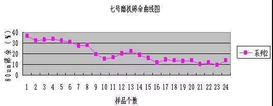 鑒于六七號磨機的狀況,我們對兩臺磨機停磨進磨觀察,六號磨機內(nèi)兩倉料球比過高,進磨后看不到鋼球,物料高出一個鋼球的高度,正常情況下鋼球應該高出料面露出半個鋼球為最佳,隨現(xiàn)場測量計算六號磨一倉填充率為28.7%二倉為29.0%;七號磨機進磨觀察一倉鋼球露出料面一半,說明填充率應該是可以的,測量計算一倉的填充率為31.2%二倉為29.2%;這種磨機的最佳填充率一倉為30%左右二倉為31%左右。隨取七號磨樣做了磨機的篩余曲線,磨機均采用急停的停磨方式,入磨共取樣品24個做80um和200um的篩余。見圖1。
