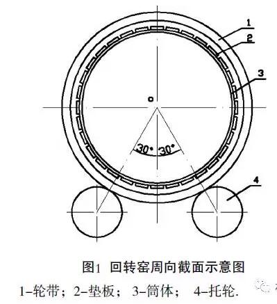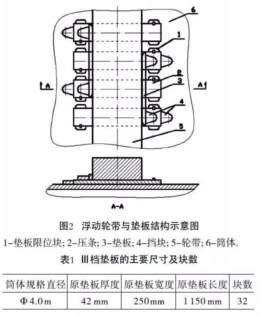 我公司生產的回轉窯采用浮動輪帶支撐窯筒體,輪帶是實心矩形斷面活套套在筒體上,加固窯筒體,見圖1。輪帶與筒體之間均勻分布著32塊墊板,避免輪帶內表面與筒體外表面直接接觸。圖2為浮動輪帶與墊板結構示意圖。表1為Ⅲ檔原墊板 的主要尺寸及塊數(shù)。在回轉窯運轉過程中,筒體、輪帶和墊板之間留有一定的間隙。表2為輪帶內徑與墊板外徑之間的間隙,這樣必然引起輪帶與筒體墊板之間產生滾動和滑移。我公司生產的回轉窯已運轉僅年,墊板與輪帶內圈均有不同程度的磨損,使輪帶起不到加固筒體作用,造成筒體橫截面變形增大,同時輪帶和墊板之間產生很大滑移,已超過極限值,致使限制輪帶軸向竄動的壓條頻繁被推掉。