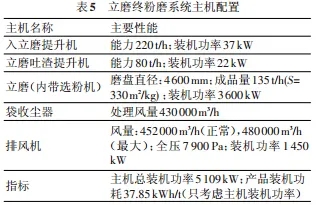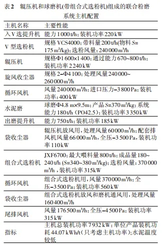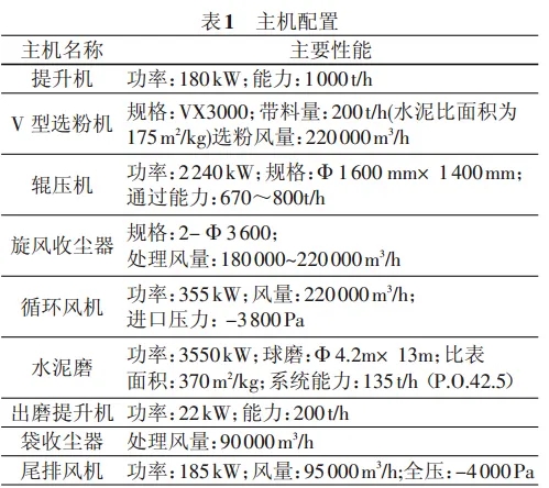 此系統(tǒng)主要由 V 型選粉機(jī)、輥壓機(jī)、旋風(fēng)收塵器、球磨機(jī)和組合式選粉機(jī)組成,球磨機(jī)系統(tǒng)為閉路系統(tǒng),流程圖見(jiàn)圖 3,主要的主機(jī)配置見(jiàn)表 2。其中輥壓機(jī)系統(tǒng)設(shè)有單獨(dú)放風(fēng)系統(tǒng),球磨機(jī)單獨(dú)通風(fēng)與組合式選粉機(jī)放風(fēng)共用一套收塵系統(tǒng)。