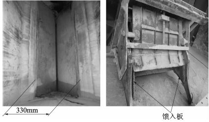 2)輥壓機喂料裝置通過口太小,只有1500mm×280mm,不能滿足過飽和喂料要求。兩側(cè)饋入板磨損嚴(yán)重,存在邊緣效應(yīng)。