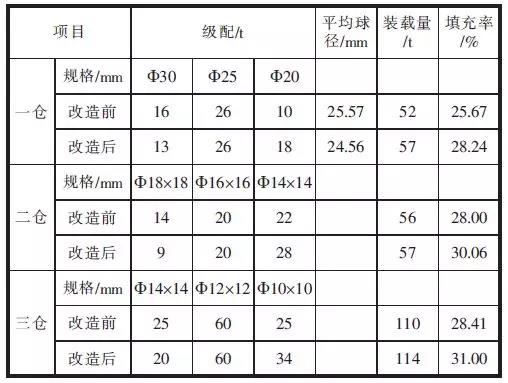 6)磨機研磨體用振動篩嚴(yán)格篩撿,淘汰不合格研磨體;人工清理隔倉板篦縫,保證磨內(nèi)每條篦縫暢通,要求達(dá)到“料走篦縫,風(fēng)走通風(fēng)圓”,避免調(diào)風(fēng)時細(xì)度跑粗或磨頭冒正壓。清理檢修后,磨主機電流由345~350A上升到355~360A,磨尾壓力由-600~-800Pa降低到-400~-600Pa。7)調(diào)整磨內(nèi)研磨體級配,提高磨機各倉填充率,降低平均球徑,增大研磨面積,從而降低物料流速,提高出磨水泥比表面積。改造前后磨內(nèi)研磨體級配情況見表2(磨機設(shè)計研磨體大裝載量235t,調(diào)整后裝載量為228t,符合設(shè)計要求)。