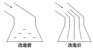 5)將V型選粉機下料溜子改為四通道下料方式,保證物料在V型選粉機內(nèi)部形成均勻料幕(見圖3),提高選粉效果,預(yù)粉磨系統(tǒng)成品物料比表面積可提高到190m2/kg以上。