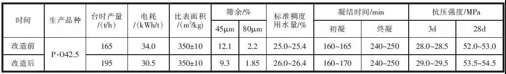 從表3可以看出,改造后生產(chǎn)P·O42.5水泥時磨機臺時產(chǎn)量提高30t/h,電耗降低3.5kWh/t,細(xì)度明顯變細(xì),水泥標(biāo)準(zhǔn)稠度用水量增加,強度提高1~1.5MPa,增產(chǎn)節(jié)能效果顯著。
