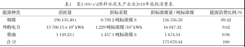 某水泥企業(yè),現(xiàn)有1條5000t/d新型干法水泥回轉(zhuǎn)窯生產(chǎn)線以及2臺(tái)180t/h水泥磨,具有年產(chǎn)普通硅酸鹽水泥熟料150萬(wàn)t和年產(chǎn)硅酸鹽水泥160萬(wàn)t的生產(chǎn)能力。主要產(chǎn)品為PO42.5和PS32.5A水泥。主要消耗的能源為煙煤、電力、柴油等。主要生產(chǎn)工序包括石灰石礦山開(kāi)采、生料制備、熟料煅燒、水泥制成。2018年該企業(yè)綜合能耗為175078.44噸標(biāo)準(zhǔn)煤。主要能源消費(fèi)情況如表1所示。