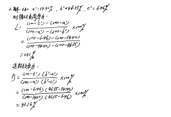 2、磨機正常運轉后,分別在出磨斜槽、粗粉斜槽及細粉斜槽各取5個樣,其0.08mm篩孔平均篩余分別是34.42%,46.55%,6.46%,求其循環(huán)負荷率和選粉效率。