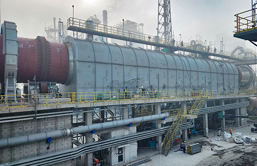 轉化焙燒:鋰輝石精礦從精礦庫人工送至斗式提升機提升至精礦倉,再經(jīng)圓盤給料機和螺旋給料機加入碳酸鋰回轉窯窯尾,利用窯尾預熱段高溫氣體干燥精礦,精礦在煅燒段約1200℃左右的溫度下進行晶型轉化焙燒,由α型(單斜晶系,密度3150kg/m3)轉化為β型鋰輝石(四方晶系,密度2400kg/m3,即焙料),轉化率約98%。